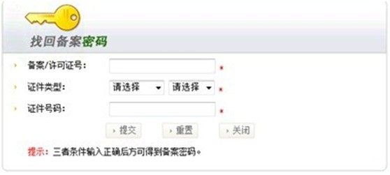 輸入您以前備案時的信息,提交后會將密碼發送到當時負責人的手機或郵箱里。