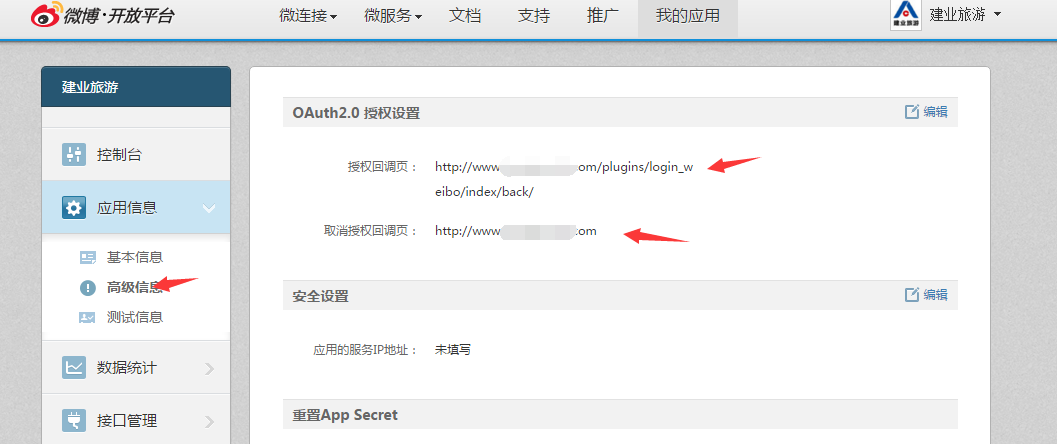 微博授權(quán)回調(diào)地址填寫見下圖箭頭指向的.涂改部分填寫自己的網(wǎng)站域名即可.