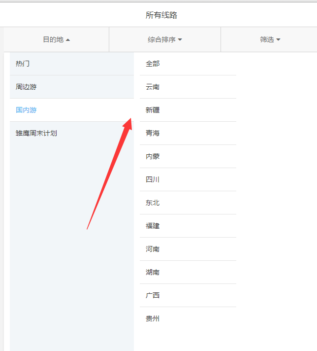 關(guān)于手機(jī)版的產(chǎn)品篩選頁(yè)目的地的顯示設(shè)置,以線路產(chǎn)品為例: