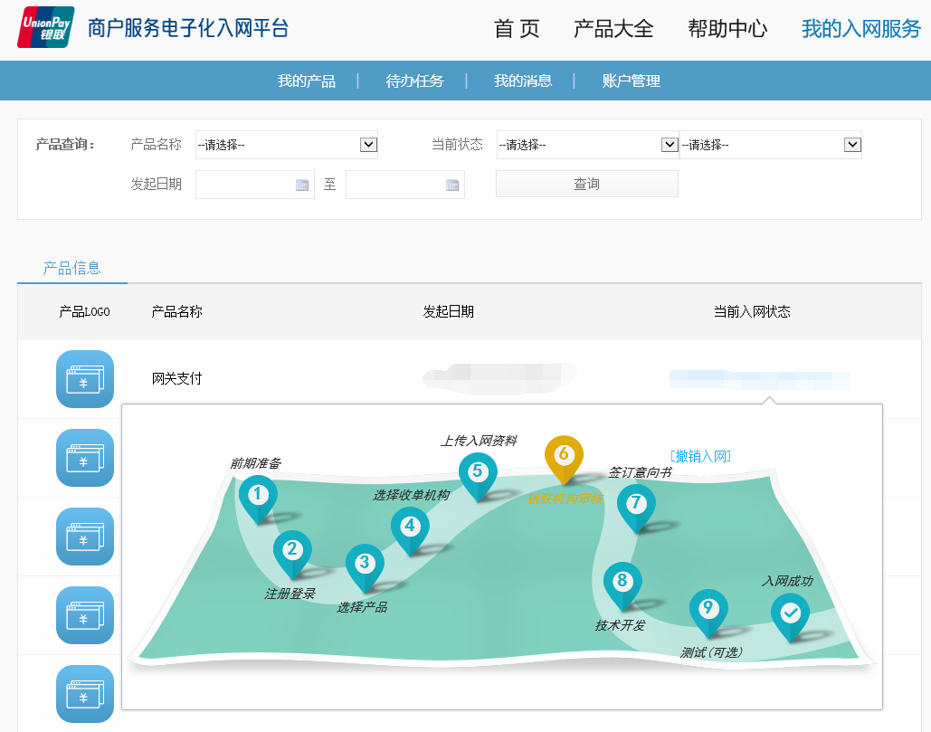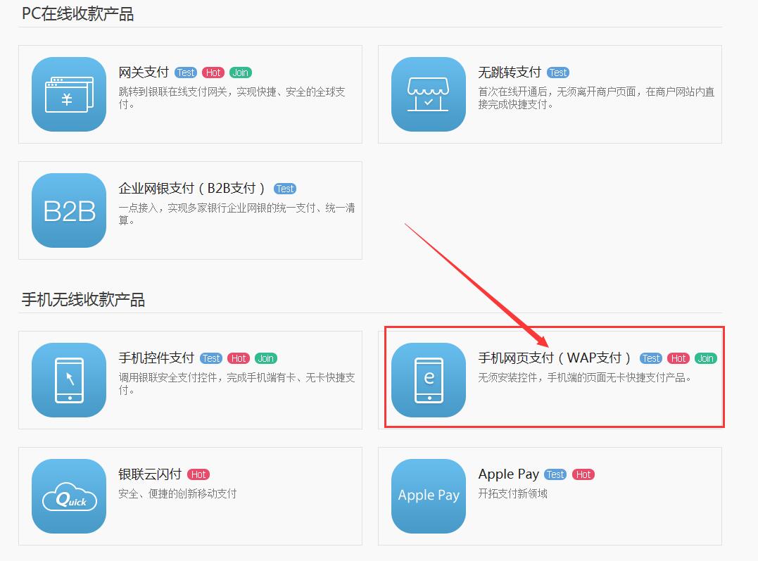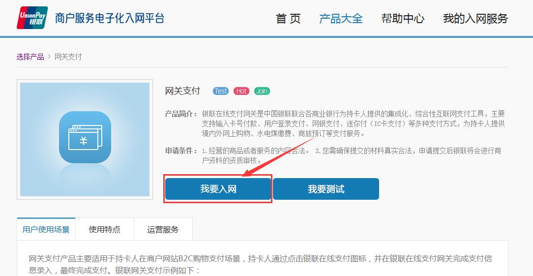 2、注冊并登錄商戶賬號,進入產品大全,選擇對應的產品,發起我要入網的審核流程。如果只需要PC端網頁支付的,申請網關支付即可。如果需要在移動端網頁支付的,申請手機網頁支付(WAP支付).