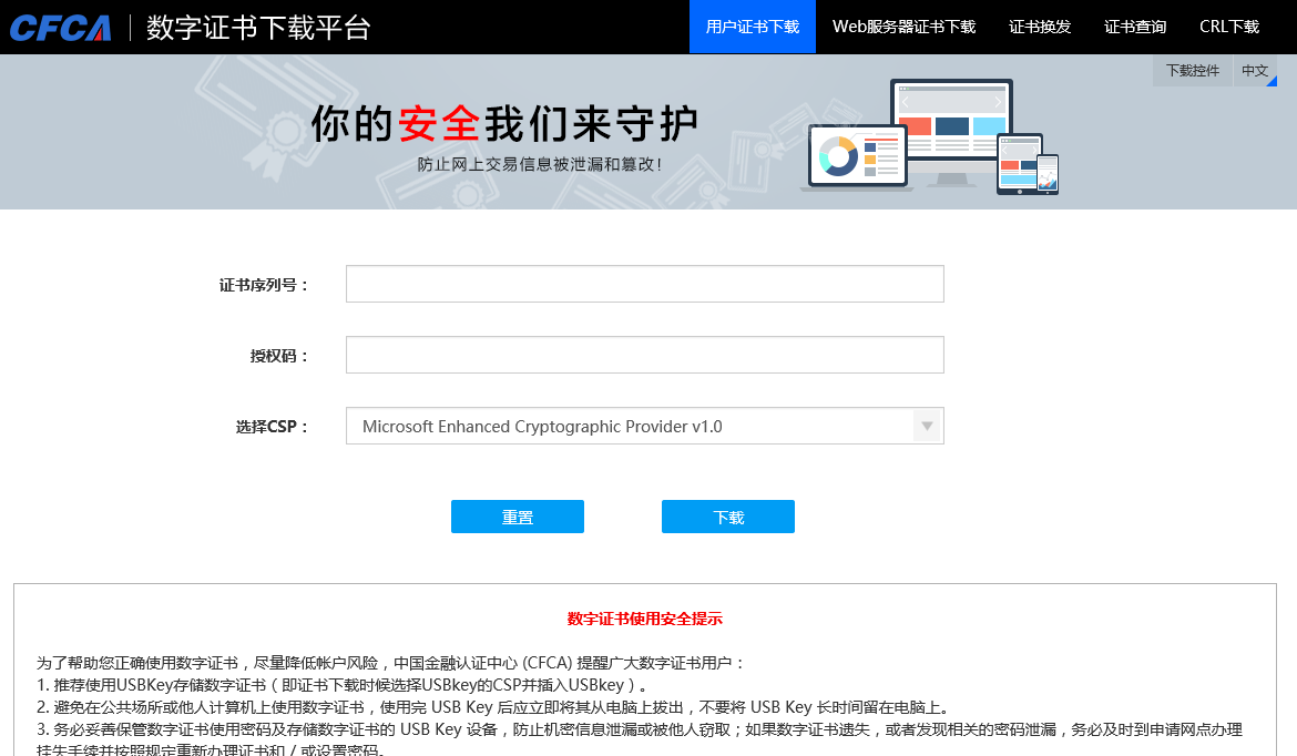 1、進入中國金融認證中心:http://www.cfca.com.cn/,找到“證書下載”,點擊下載;