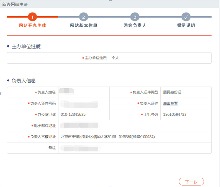 第一步:網站開辦主體,已經提交申請或審核已經通過,直接點擊【下一步】即可;