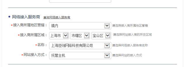 ③ 網絡接入服務商,域名注冊服務商:可以選擇境內與境外,在境內可以按照地域去進行選擇,當找不到所使用的服務商時,選擇其他可以手動輸入服務商名稱等信息。