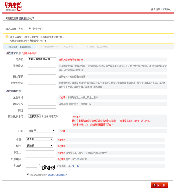 3、填寫相關信息并上傳營業(yè)執(zhí)照后,點擊【下一步】;