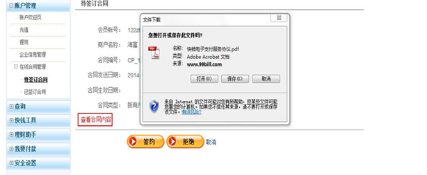 3、點擊查看合同內(nèi)容,彈出合同文件下載框,點擊“打開”可以打開查看合同,點擊“保存”可以保存合同,