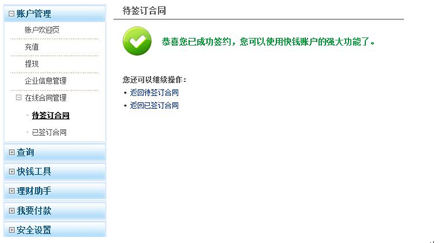 4、簽約后,頁面會提示“恭喜您已成功簽約…”您可使用快錢賬戶相應的功能。