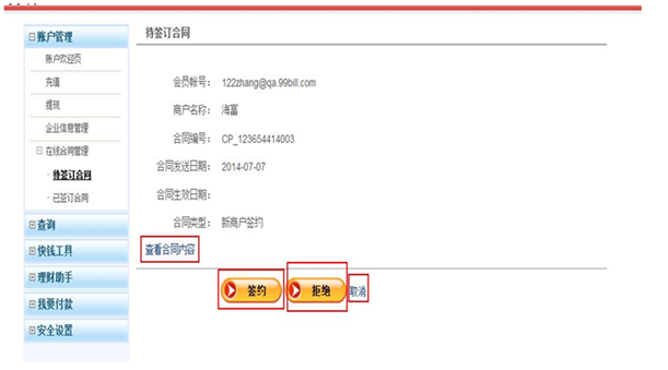 1、使用默認操作員admin賬號登錄快錢賬戶后,賬戶歡迎頁會提示有待簽約合同;