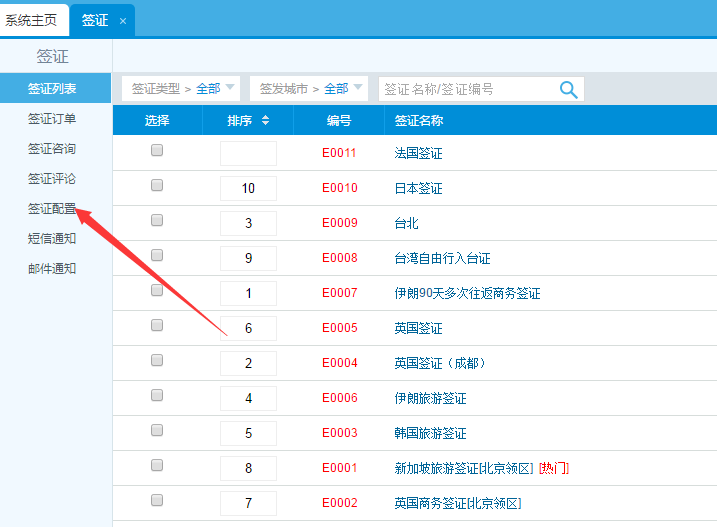 第二步:點(diǎn)擊進(jìn)入簽證里面的“簽證配置”,然后進(jìn)入“簽證區(qū)域”設(shè)置一級目的地和二級目的地;