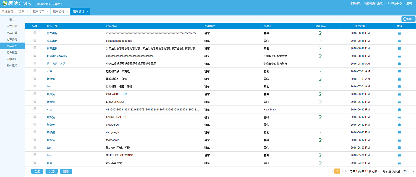 針對前臺租車產品詳情頁當中,購買該產品的用戶消費完成的評價管理,評價管理在后臺可以審核,查看隱藏,刪除等。后續考慮支持管理人員在后臺新增評價。