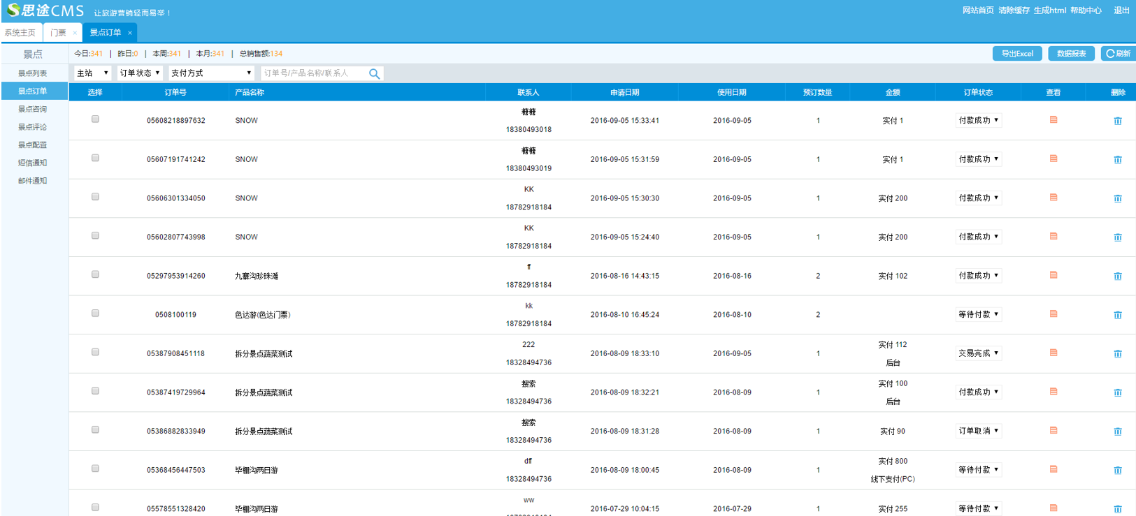 門票訂單列表是針對門票產品訂單進行查看管理的,可以通過該列表查看門票訂單的狀態,并進行訂單管理操作。