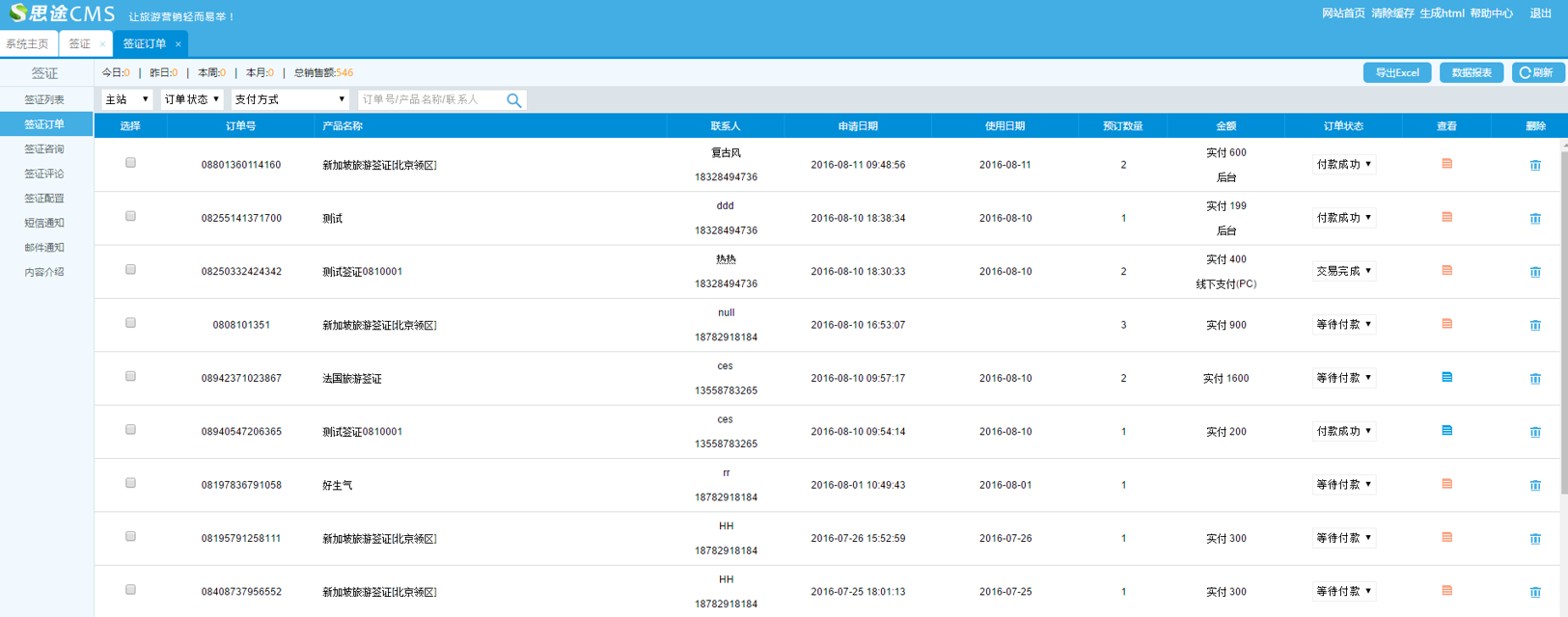 針對銷售的簽證產品訂單進行管理,可對訂單狀態(tài)進行修改,并支持多種支付方式設定。