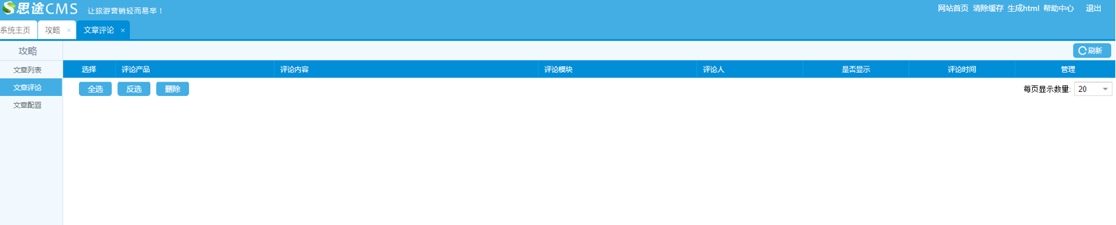 針對前臺攻略詳情頁會員發布的攻略在后臺可以進行評論管理,評論管理在后臺可以審核,查看隱藏,刪除等。后續考慮支持管理人員在后臺新增評價。