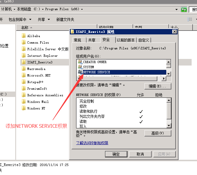3,將偽靜態插件解壓出來的目錄添加NETWORK SERVICE權限