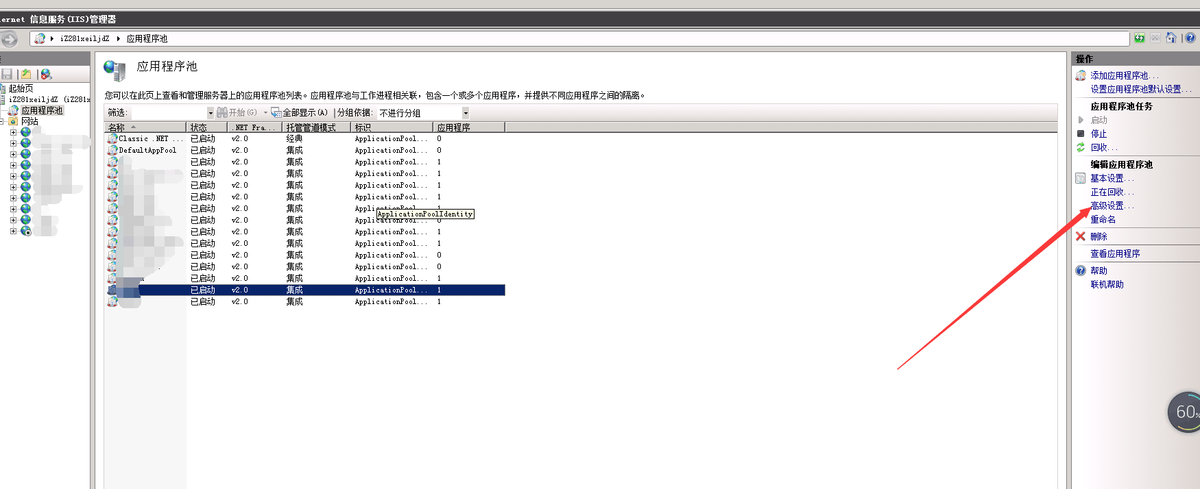 6,在網站對應的應用程序池中點擊高級設置