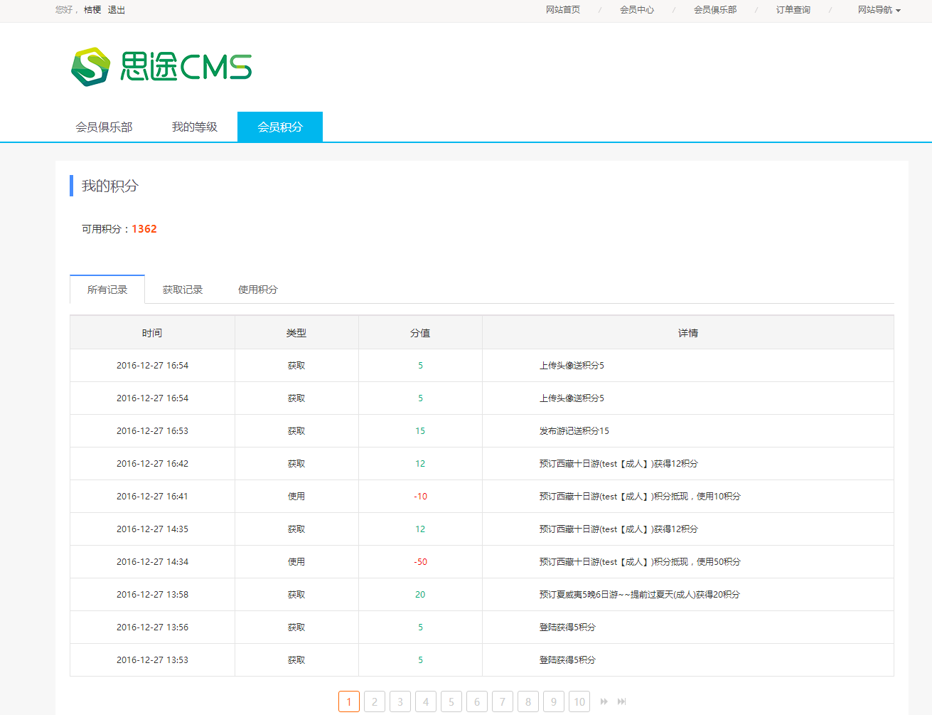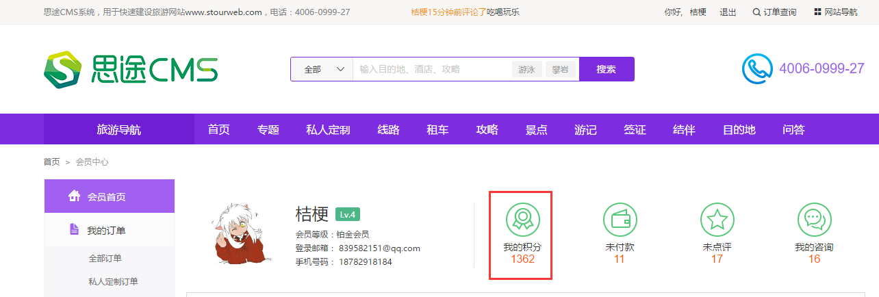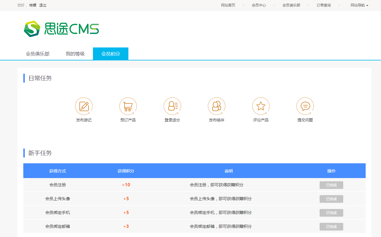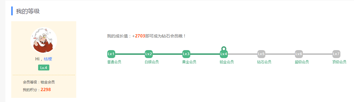 (1)我的等級:顯示會員昵稱和等級、注冊網站后所獲得的所有積分、以及等級的增長進度