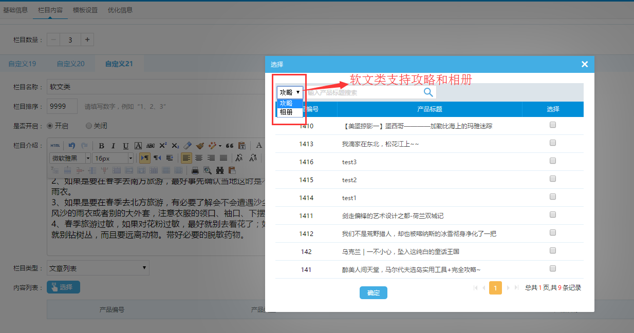 (2)添加產品欄目:只支持已經購買安裝的產品