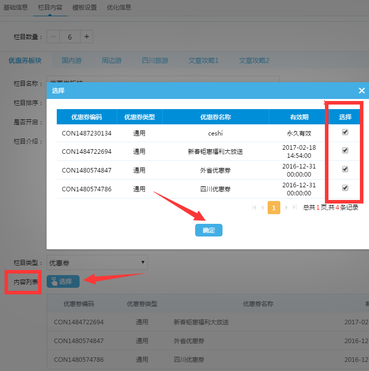 ?內容列表處點擊選擇,勾選需要在這個專題展示的優惠券產品即可