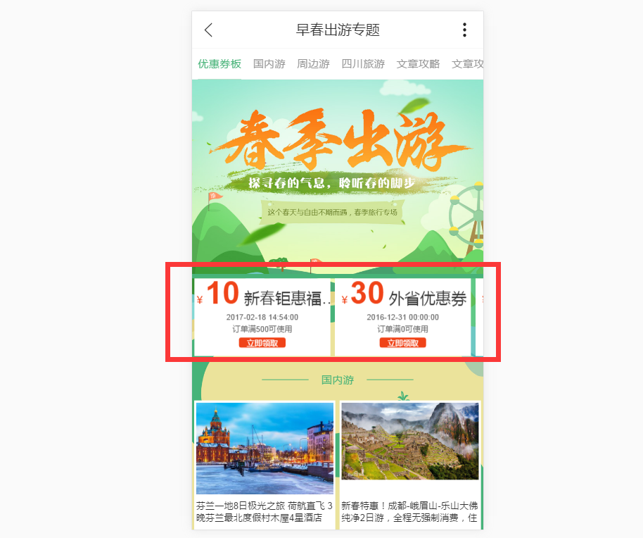早春出游專題模板優惠券模塊需要購買優惠券應用才會有優惠券模塊展示(沒有購買不會展示)