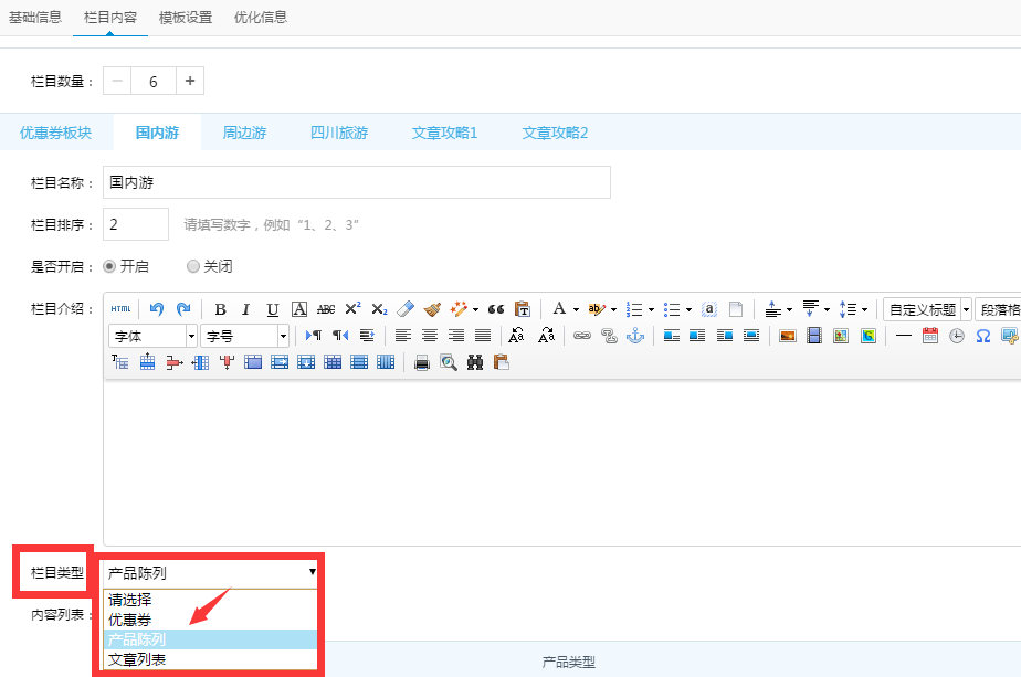 在欄目類(lèi)型處選擇:產(chǎn)品陳列