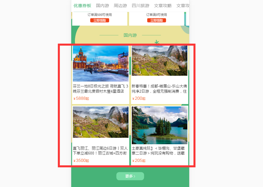 以上步驟操作完成后,專(zhuān)題頁(yè)面國(guó)內(nèi)游板塊就會(huì)展示勾選的這幾個(gè)線路產(chǎn)品
