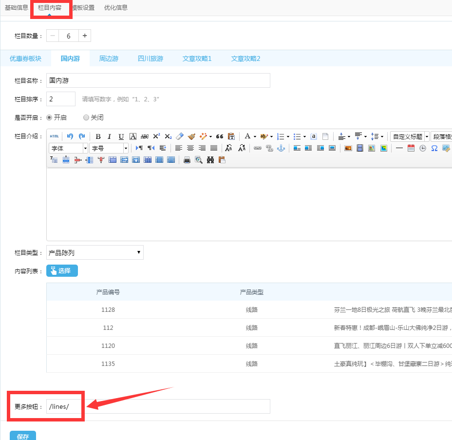 比如下方截圖中,在更多按鈕處填寫(xiě)了/lines/ 這是線路欄目首頁(yè)的鏈接,客戶(hù)在專(zhuān)題頁(yè)國(guó)內(nèi)游模塊下就會(huì)對(duì)應(yīng)有一個(gè)更多的按鈕,點(diǎn)擊更多就可以跳轉(zhuǎn)到設(shè)置的/lines/頁(yè)面