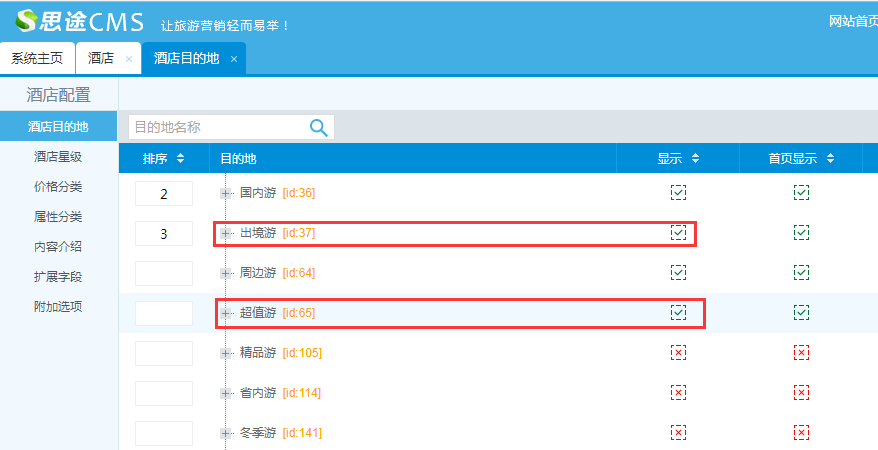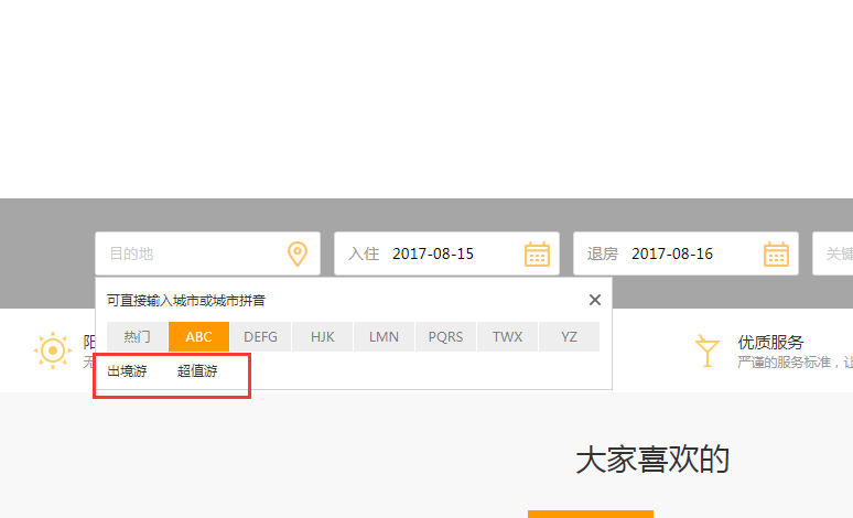 一、首頁搜索框中的目的地是調(diào)用網(wǎng)站后臺酒店--酒店配置--酒店目的地開關按鈕開啟的目的地;