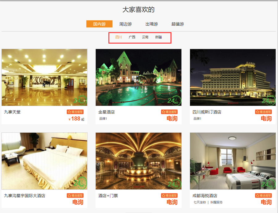此版塊是提取酒店產(chǎn)品,可以設(shè)置六個一級目的地,以下圖為例共有國內(nèi)游、周邊游、出境游、超值游、精品游和省內(nèi)游: