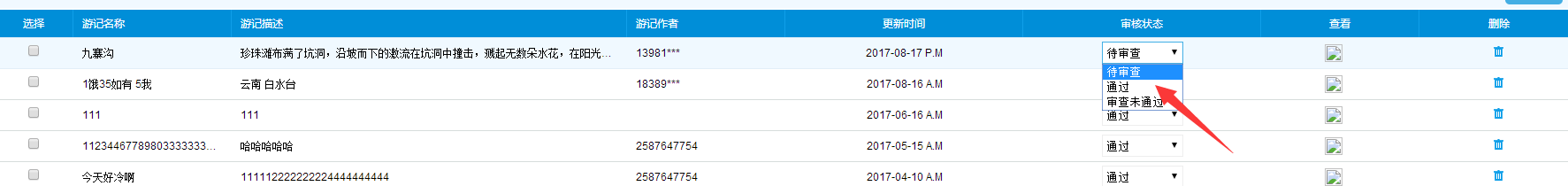 發(fā)布成功后網(wǎng)站管理員在后臺(tái)的游記模塊》游記列表審核