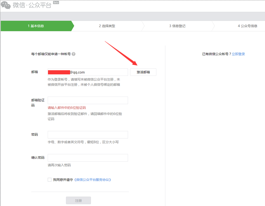 直接輸入驗證碼,并且設置好密碼,點擊注冊,然后選擇服務號: