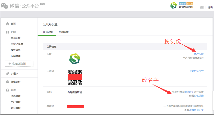 設置微信公眾號的頭像和微信號,點擊頭像可以設置頭像和微信號,方便用戶查找: