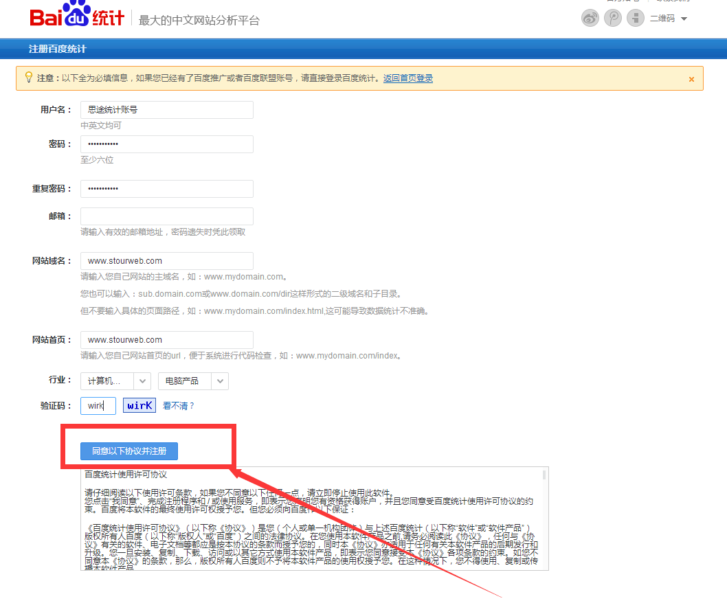 填寫用戶名、密碼、郵箱、網站域名等信息,點擊同意以下協議并注冊。