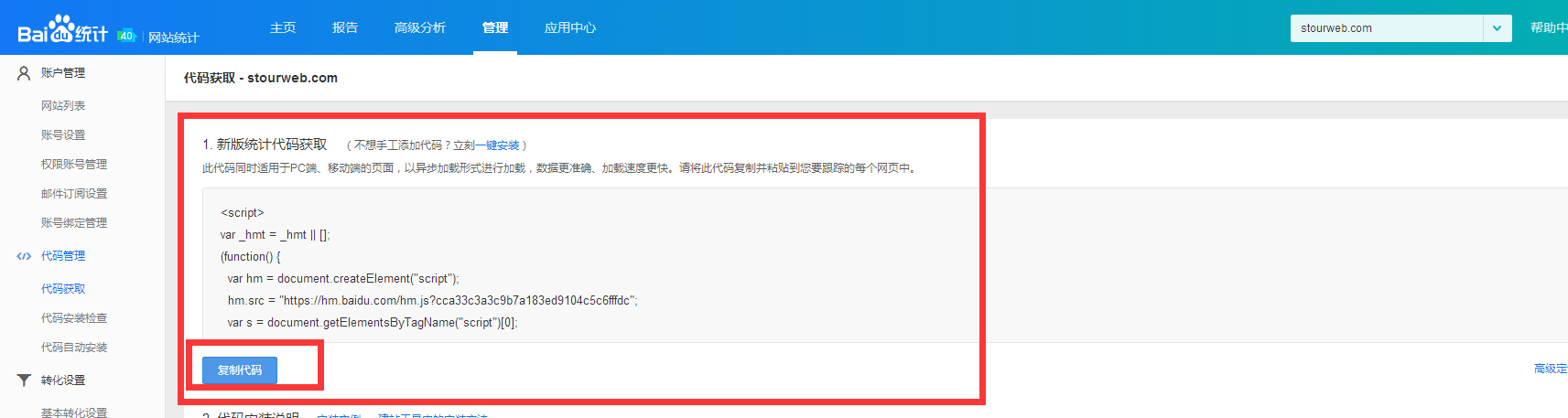 注冊完成后,直接獲取本域名的統計代碼(www開頭域名默認為PC站點統計代碼),點擊復制代碼。