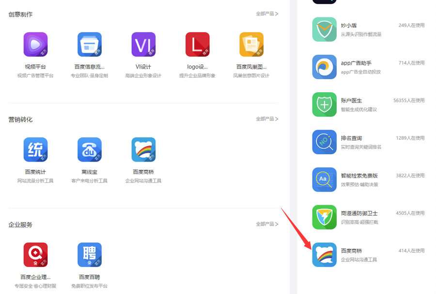 這樣我們就注冊(cè)好了百度推廣賬號(hào),進(jìn)入百度推廣賬號(hào)首頁,一直將頁面往下拉,可以看到百度商橋應(yīng)用,安裝即可: