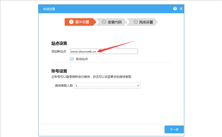 登陸后會(huì)默認(rèn)彈出快速設(shè)置窗口,請(qǐng)?jiān)O(shè)置與百度競(jìng)價(jià)推廣平臺(tái)一樣的您的網(wǎng)站域名: