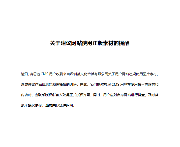 首頁(yè)  >  幫助中心  >  思途CMS產(chǎn)品公告  >  關(guān)于建議網(wǎng)站使用正版素材的提醒