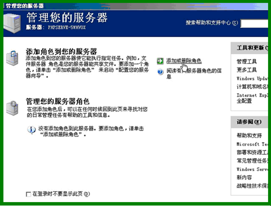 打開“開始”菜單,點擊“管理您的服務器”(如圖所示),點擊“添加或刪除角色”(如圖所示)。