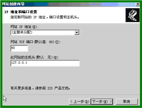 進入向導后,進入下一步,為網站添加描述,也就是IIS中顯示的網站標示,可以隨便填寫,再進入下一步,為網站配置主機頭,我們是用來配置本地測試環境,所以把主機頭配置為127.0.0.1(如圖所示)