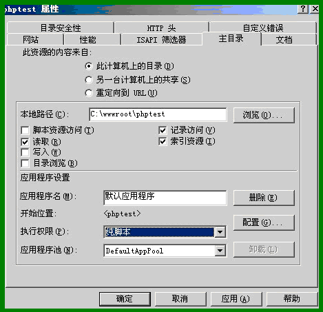 首先打開IIS管理器,然后在先前測試IIS的網站上右鍵,進入“屬性”,點擊主目錄選項卡,然后將“執行權限”配置為“純腳本”,(如圖所示)