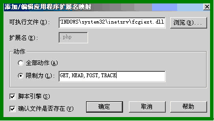 然后點擊旁邊的“配置”,查看是否有.php擴展名,如果沒有的話,需要添加一個新項,將可執行文件指向“C:WINDOWSsystem32inetsrvfcgiext.dll”,擴展名為“.php”(注意有個點),動作限制為“GET,HEAD,POST,TRACE”,點擊確定即可(如圖所示)