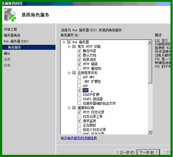 點擊“下一步”之后,需要選擇功能,這里需要比默認選項多增加一個“cgi”(如圖所示)