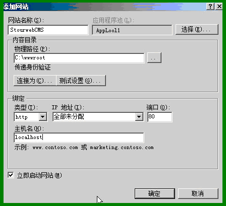 再新建一個網站,在“網站”上右擊,點擊添加網站,會出現信息網站添加的表單,首先輸入網站名稱,例如“stourwebcms”,路徑選擇為網站存放的路徑,單IP的服務器可以不必選擇IP,主機頭填寫為localhost,然后點擊確定。