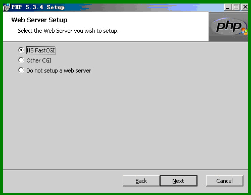 在前面已經提過,IIS7中不必單獨安裝fastcgi,所以,我們只需要下載php安裝包進行安裝即可,下載地址:http://windows.php.net/downloads/releases/archives/ 下載好后,打開安裝程序,經過引導,配置好路徑,來到選擇“web server setup”的地方,在這里我們選擇“IIS fastcgi”(如圖所示)