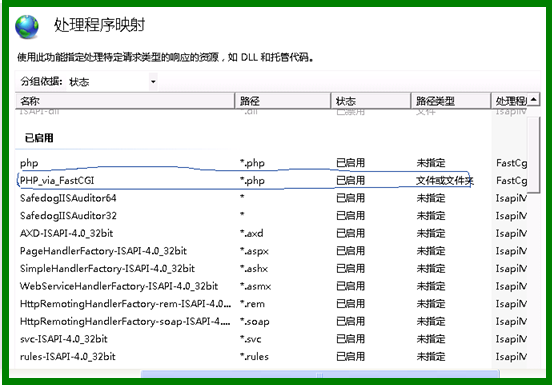 當php安裝完成后會自動在iis的處理程序映射中增加一條fastcgi到php的映射關系(如圖所示)