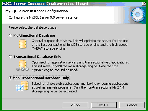 接下來是選擇服務器使用,第一個是多功能數據庫,可以使用 InnoDB engine和MyISAM engine。第二個選項,它的性能偏向于InnoDB,但是同時支持MyISAM engine。第三個選項是偏向于分析功能的MyISAM。至于這三個選項有什么區別,其實只要知道,MyISAM類型的數據庫引擎可以為php提供強大的檢索和分析功能。InnoDB的性能則偏重于存儲。