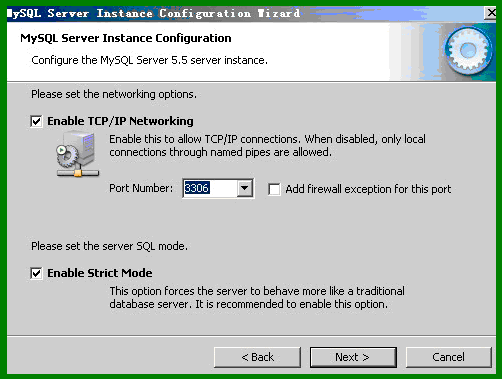 之后是網絡連接的選項,“enable TCP/IP Networking”可以按照需求來選擇,如果不做集群的話可以把勾去掉,如果是在內網環境,不為mysql做路由規則是完全可以打開此項的。可以直接添加一個防火墻例外給3306端口。端口號可以選擇,但是推薦默認的3306。