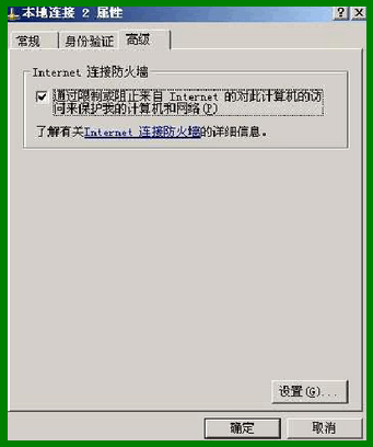 2) 然后鼠標右鍵單擊“本地連接”,選擇“屬性”。如圖選擇“高級”選項,選中“Internet連接防火墻”,確定后防火墻即起了作用。