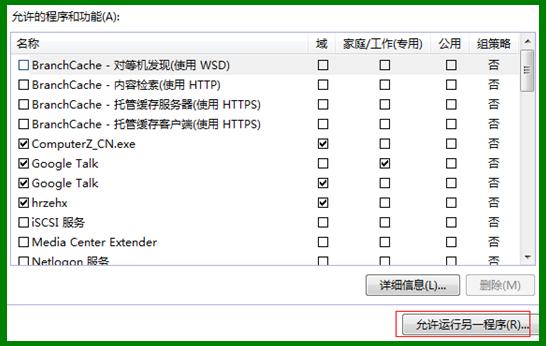 3) 單擊“允許程序或功能通過Windows防火墻”彈出網絡服務端口配置窗口,在此窗口中可以選擇允許打開端口并通信的網絡服務,單擊“允許運行另一程序”來自定義開啟某一網絡服務或端口