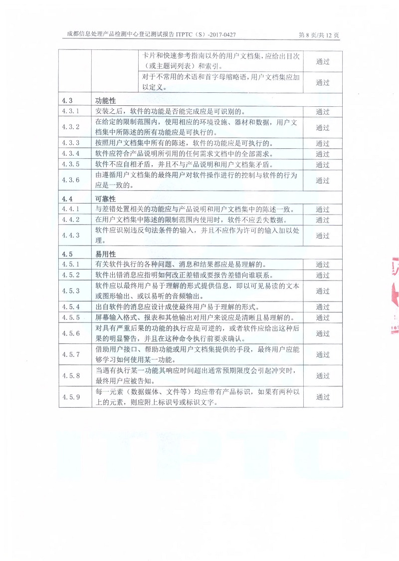 測試結(jié)果顯示,所有軟件產(chǎn)品綠色安全,不含惡意代碼和病毒;用戶文檔完善,包含產(chǎn)品使用各個方面的所有必要信息,采用軟件特定使用群體可理解的術(shù)語和文體,簡潔易懂;軟件所有應(yīng)用功能均可執(zhí)行,運行過程中具有極高可靠性;軟件操作使用簡單,用戶使用難度低。