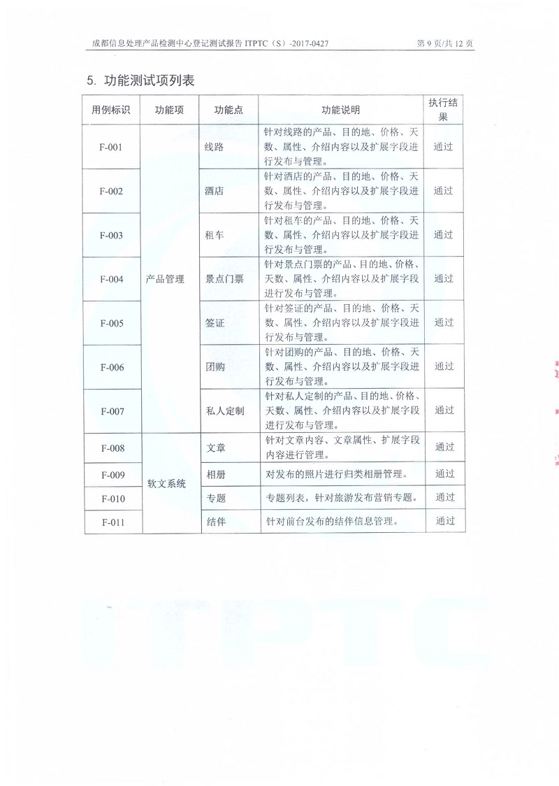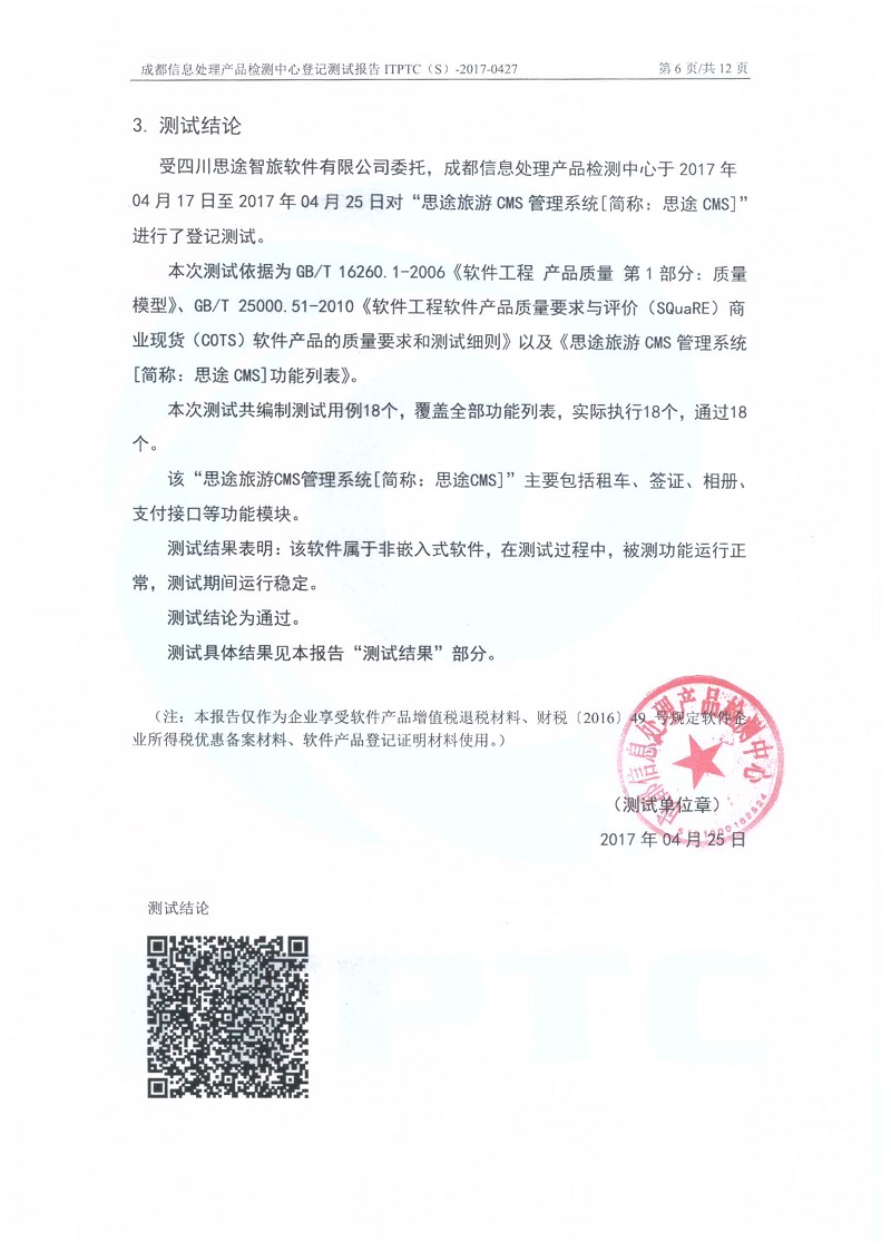 2017年4月17日至4月25日,成都信息處理產(chǎn)品檢測中心(簡稱:ITPTC)對思途旅游CMS管理系統(tǒng)?進行了登記測試,本次測試共編制測試用例18個,覆蓋全部功能列表。實際執(zhí)行18個,通過18個,產(chǎn)品品質(zhì)完全符合ITPTC的各項標準。思途于4月25日被授予ITPTC證書,成為通過ITPTC認證的軟件產(chǎn)品企業(yè)。