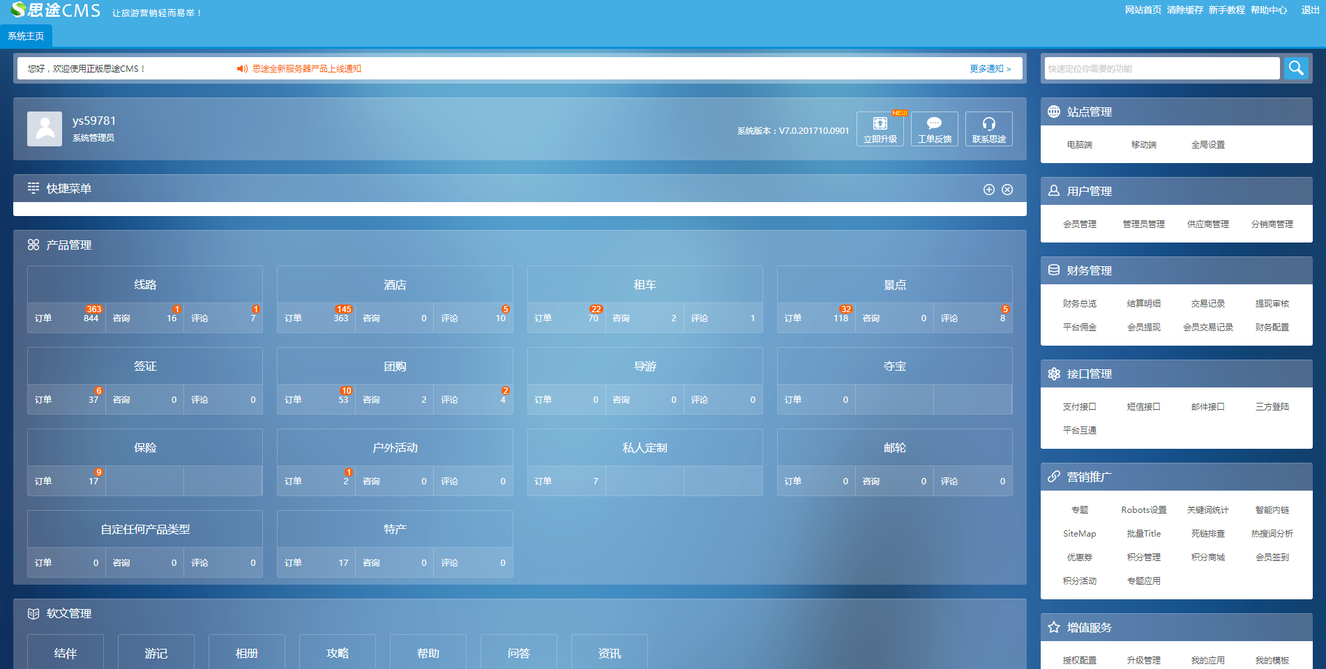 思途旅游CMS系統(tǒng)功能完善,所有的網(wǎng)站基本設(shè)置和產(chǎn)品管理都可以在后臺完成。對于熟悉系統(tǒng)的用戶來說配置這些信息當(dāng)然沒有問題,但對新用戶來說,很可能遇到下面的情況: